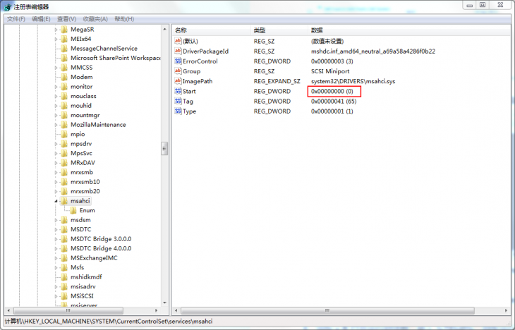 4、修改注冊表,HKEY_LOCAL_MACHINE\System\CurrentControlSet\Services\Msahci 表項中,將 Start 鍵值修改為 0