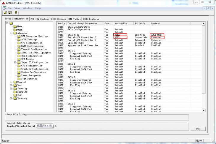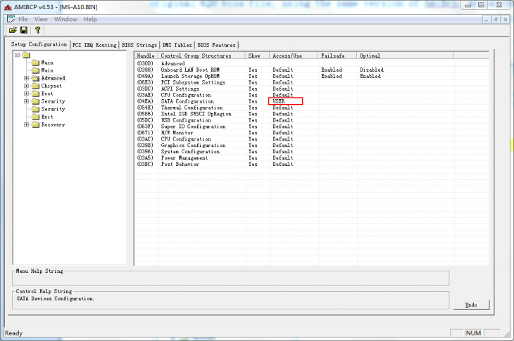 7、找到名稱為 MS-A10.bin 文件,用鼠標拖拽至步驟 3 中備用的 AMIBCP 界面打開,此時就進入了 BIOS 編輯界面